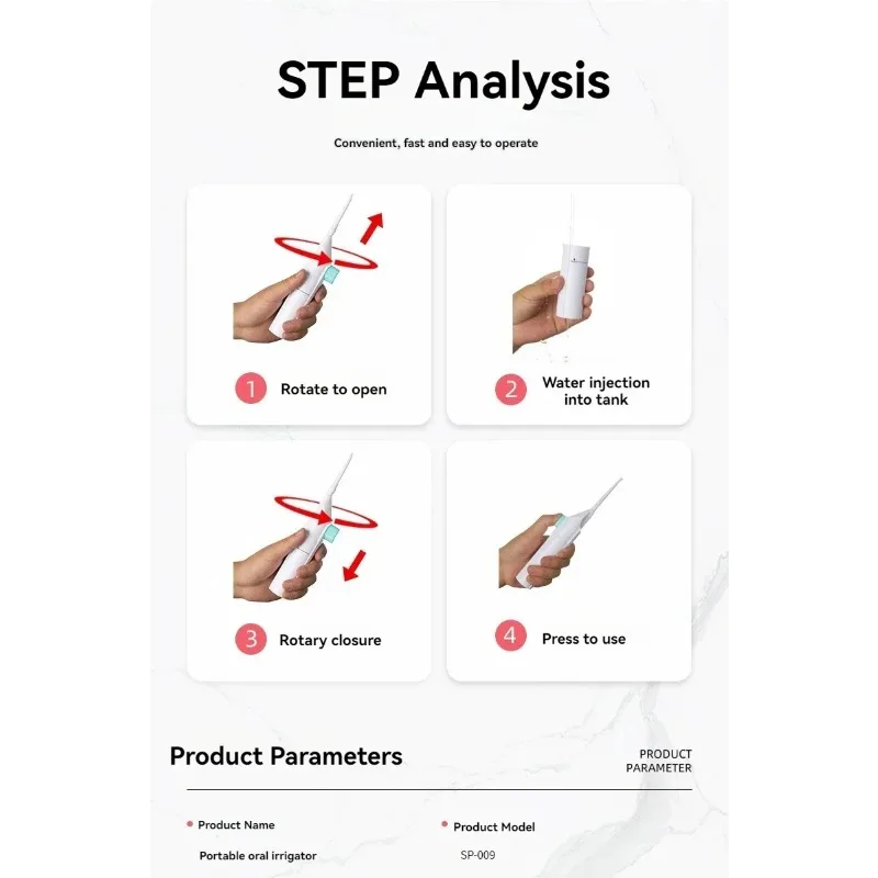The manual high-pressure water toothpick offers a gentle yet effective way to remove plaque and food particles.